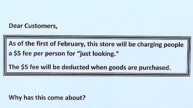 Un negozio di Coorparoo, in Australia, ha detto basta a tutti quelli che entrano “solo per guardare”, ed ha introdotto una tariffa di 5 dollari per chi entra, eventualmente dedotta dall’acquisto che il cliente fa. In altre parole: chi entra e non compra nulla deve pagare 5 dollari.
