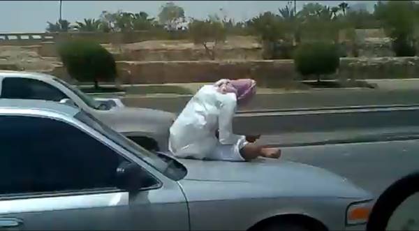 Non è passato inosservato il video di un uomo che usa tranquillamente il cellulare seduto sul cofano di un’auto in corsa su un’autostrada dell’Arabia Saudita.