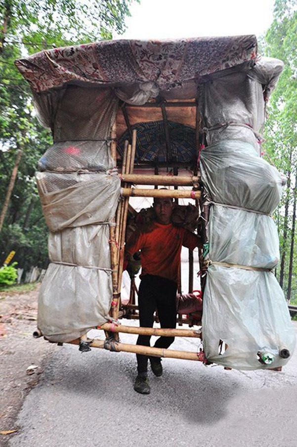 Un trentottenne cinese ha trovato la sua personale soluzione al problema: portarsi la casa sulle spalle, un po’ come una lumaca o una tartaruga.  Liu Lingchao, che vive nella Provincia del Guandong, si è costruito la prima “casa portatile” cinque anni fa, per avere sempre un tetto a disposizione dovunque lo portasse il suo lavoro: Liu raccoglie bottiglie e lattine dalle strade, per poi rivenderle. Proprio per questo motivo di strade ne deve percorrere molte: adesso sta compiendo a piedi un percorso di circa 350km attorno alla sua città alla ricerca di materiali da rivendere.