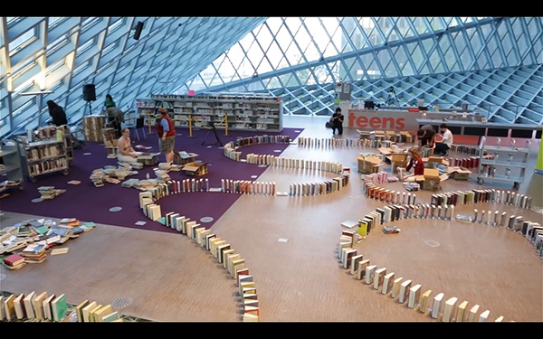 I domino hanno un fascino notevole: una catena di oggetti che si abbattono l’un l’altro non può lasciare indifferenti. E sarà forse per questo che la Seattle Public Library ha iniziato l’estate creando lo scorso 12 giugno il più lungo domino di libri, nell’ambito di una campagna per promuovere la lettura.