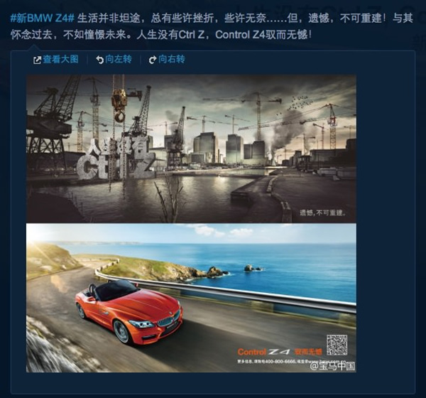 Coinvolgendo diversi “opinion leader”, BMW ha convinto gli utenti della piattaforma di microblogging Weibo (uno dei social network più usati in cina) che il secondo venerdì di luglio di ogni anno sarebbe la “giornata mondiale del rimpianto”, in cui le persone sarebbero stimolate a pensare a cosa vorrebbero cambiare della propria vita. Da qui il “Ctrl-Z day” (dalla combinazione di tasti che permette di annullare l’ultima azione nella maggior parte dei programmi).