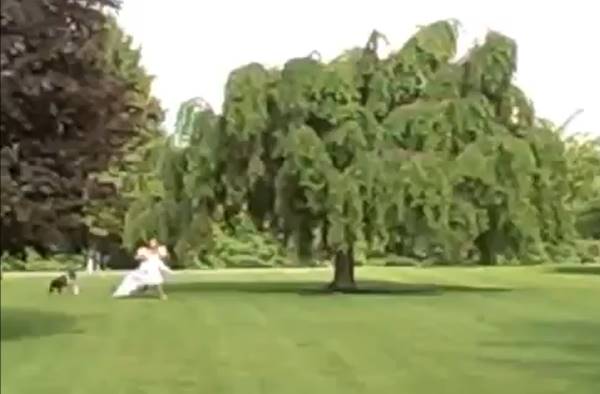 Ma avere un cane allegro e giocherellone a volte ha degli effetti collaterali. Tess, questo il nome del cane, si è liberata ed è andata incontro alla sposa: la ragazza ha tentato di sfuggire al cane, per non rovinare l’abito, ma questa fuga ha convinto il cane che si trattava proprio di un gioco, e ne è nato un buffo inseguimento della sposa, riuscendo alla fine a “stendere” la ragazza.