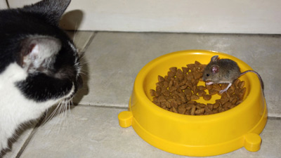 Il gatto ha ripiegato sulla ciotola dell’acqua, poi ha raccolto il suo coraggio per andare a cercare di vedere più da vicino il  topo. Il topolino però, pur prudente, non sembrava particolarmente preoccupato del gatto: quanto si è saziato, ha finito il suo pranzo e se ne è andato con calma.