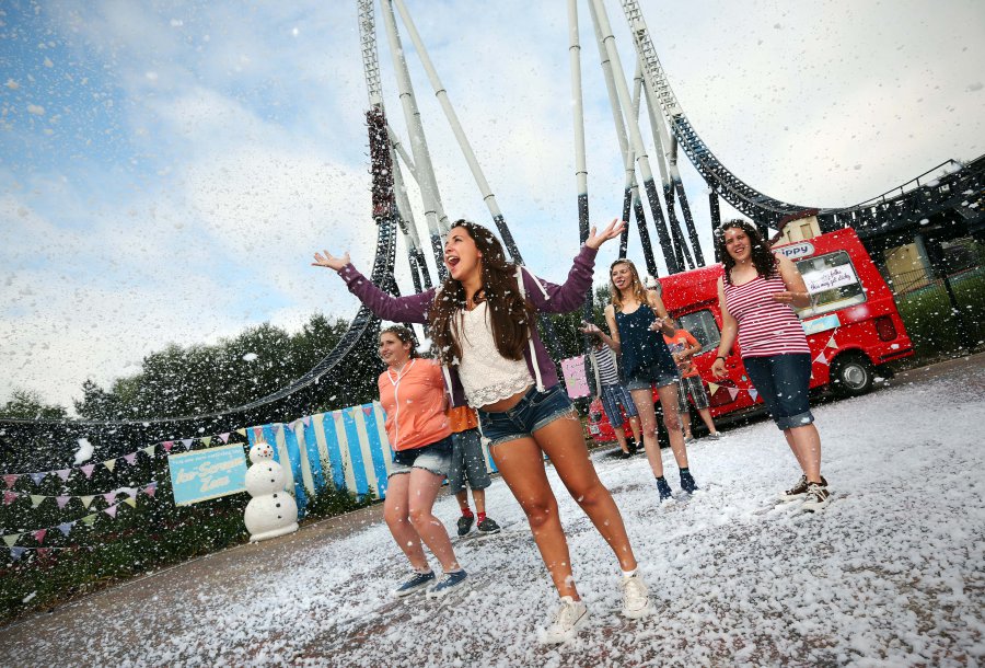 Un parco divertimenti di Londra ha una nuova attrazione: uno spazio dove piovono fiocchi di gelato. Posta all’ombra delle montagne russe di Thorpe Park, la curiosa attrazione è stata ideata da Miss Cakehead, un’artista-pasticcere nota per avere creato un albergo dall’arredamento interamente commestibile, che è stato aperto per un solo giorno a inizio 2013.