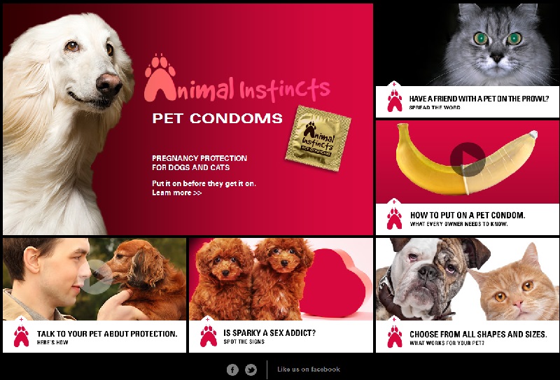 Oltre ad avere una grande immagine dove propone gli insoliti prodotti, ci sono anche numerosi link, che spiegherebbero come fare indossare il preservativo all’animale, le varie forme e dimensioni in vendita, e molto altro.