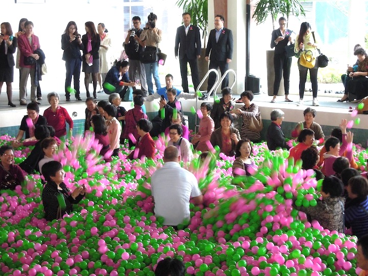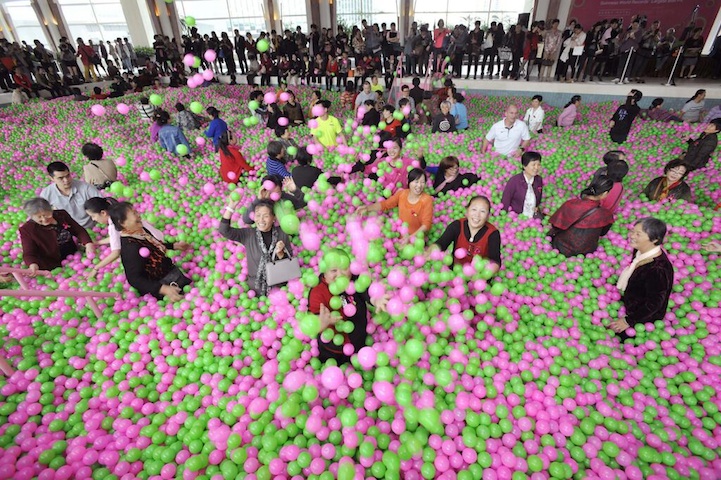 Lo scorso ottobre è stata realizzata al Kerry Hotel di Shanghai la piscina con palline più grande del mondo: lunga 25 metri e larga 12, la piscina è stata riempita con ben un milione di palline.