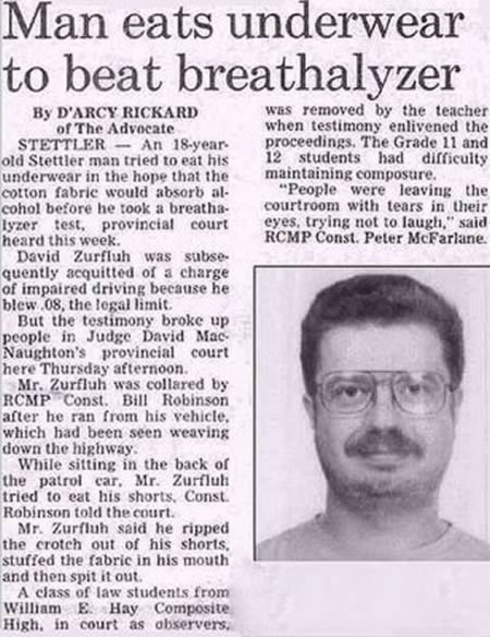 Qualche tempo fa, il diciottenne David Zurfluh di Stettler, in Canada, ha tentato di mangiarsi le proprie mutande, nella speranza che questo avrebbe abbassato il tasso alcolico rilevato dall’etilometro.