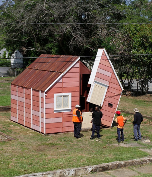 Per la verità le panche ricordano a molti quelle di una chiesa, ma va detto che il senso del progetto è quello di cercare di recuperare delle aree urbane attualmente abbandonate: la casetta-cinema infatti è stata collocata su un terreno che prima ospitava un’abitazione abbandonata, e lo scopo è quello di permettere di organizzare eventi (non solo cinematografici, ma anche concerti o rappresentazioni teatrali) e di permettere di “ri-socializzare” la zona, sfruttando una struttura che può essere spostata in caso di necessità ma anche che si “auto-protegge” da atti di vandalismo, di cui le panche probabilmente sarebbero vittime in condizioni normali.
