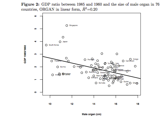 Uno studio finlandese del 2011 ha individuato una curiosa correlazione inversa tra il prodotto interno lordo di un paese e la dimensione media del pene degli abitanti: apparentemente, all’aumentare del PIL diminuirebbe la dimensione del pene (e viceversa).