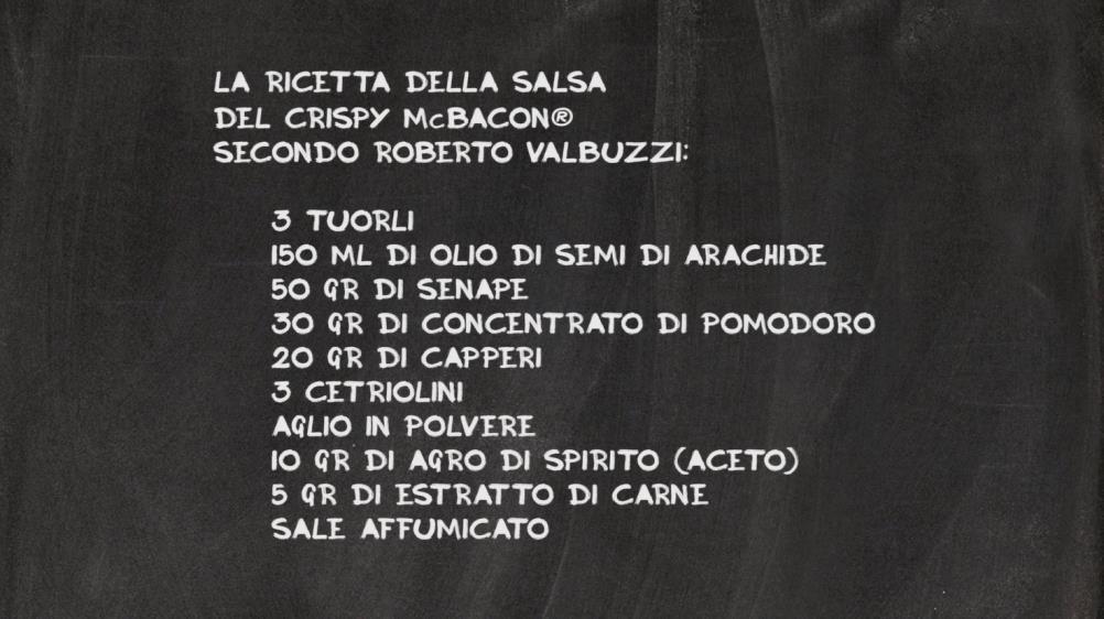 La salsa del Cripsy McBacon non è più un segreto. McDonald’s ha affidato allo chef Roberto Valbuzzi il compito di interpretare la ricetta della salsa che caratterizza questo panino particolarmente amato in Italia (non a caso la ricetta è italiana, creata dallo storico marchio di fast-food Burghy, poi acquisito da McDonald’s).