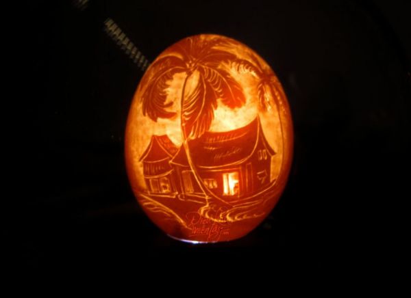 Alla fine dell’incisione, Ben Tre spesso inserisce una piccola luce Led all’interno del guscio, trasformandolo così in una sorta di lampada, ma soprattutto facendo risaltare ancora maggiormente l’incisione.