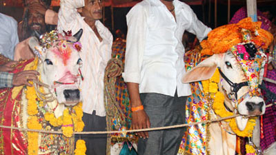 Più di 5.000 abitanti del villaggio vicino Indore, nel Madya Pradesh, hanno assistito alla cerimonia che ha unito la vacca sacra Ganga ed il toro Prakash.