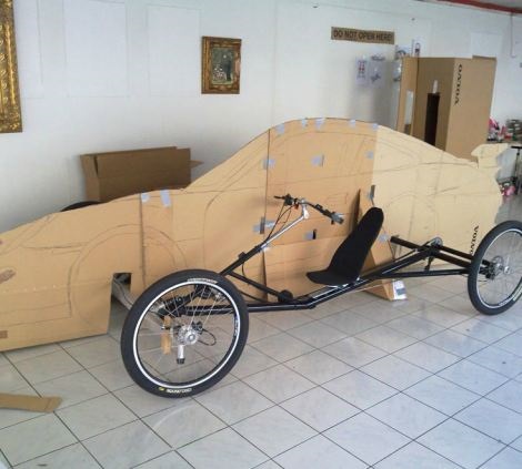 La macchina di Langeder infatti arriva appena a 10 o al massimo 15 km/h. Il motivo? Quella dell’uomo è un’auto a pedali, che si è costruito da solo (con ottimi risultati) in cartone con il telaio di alcune biciclette, utilizzando tubi di plastica per dare la forma alla carrozzeria.