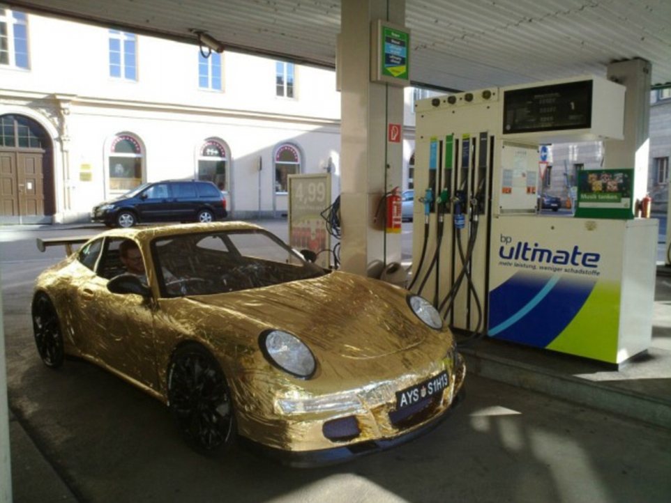 L’austriaco Johannes Langeder è entusiasta della sua Porsche dorata, anche se la velocità di punta è considerevolmente più bassa di quella che normalmente hanno queste supercar.