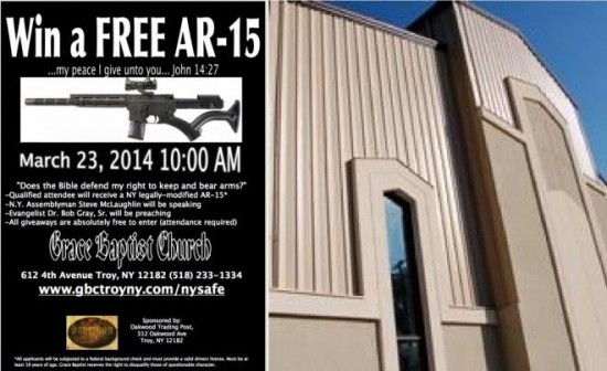 Il comandamento “non uccidere” è interpretato in maniera decisamente libera dalle Chiese americane, e sicuramente dalla Grace Baptist Church nello stato di New York, che ha messo in palio un fucile semiautomatico AR-15 in una pesca di beneficenza, peraltro organizzata durante un evento che festeggiava i cacciatori e i possessori di armi. Appare particolarmente blasfemo il fatto che come slogan del concorso sia stato usato un passaggio del Vangelo: “Vi do la mia pace [Giovanni, 14 27]”.