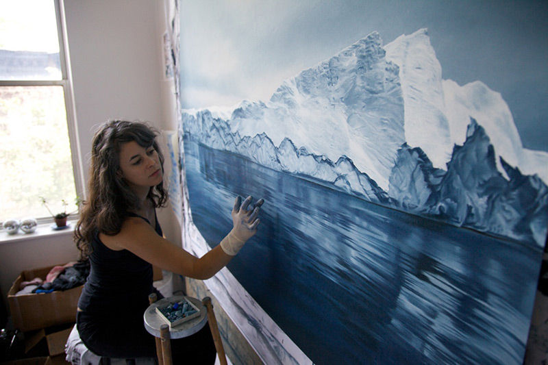 Per quanto riguarda la sua tecnica, infatti l’artista spiega: “Quando viaggio, faccio centinaia di foto e faccio piccoli schizzi. Quando torno in studio, disegno a partire dal mio ricordo dell’esperienza, così come dalle foto, per creare delle grandi composizioni. Poi aggiungo strati di colore sulla carta, sfumando tutto con le mie dita e mani”.