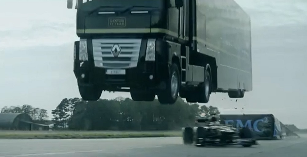 Con una delle acrobazie più incredibili degli ultimi tempi, un autoarticolato ha saltato un’auto di Formula 1 in corsa. Il camion ha saltato 25,5 metri, che secondo Lotus e EMC, che hanno organizzato l’acrobazia, sarebbe il nuovo record.