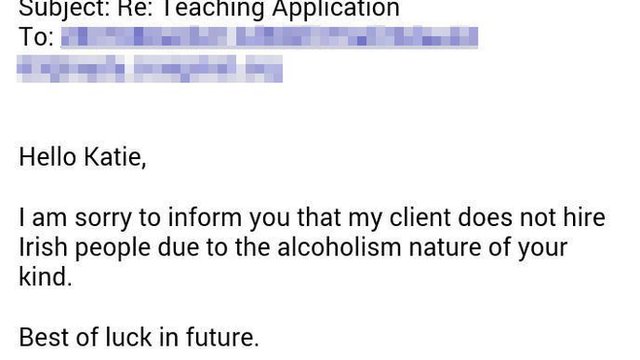 Katie Mulrenna si era candidata per una posizione di insegnante di inglese in Corea del Sud, per vedersi inaspettatamente rispondere via mail dall’agenzia che “il nostro cliente non assume irlandesi per la natura alcolista della vostra gente”.