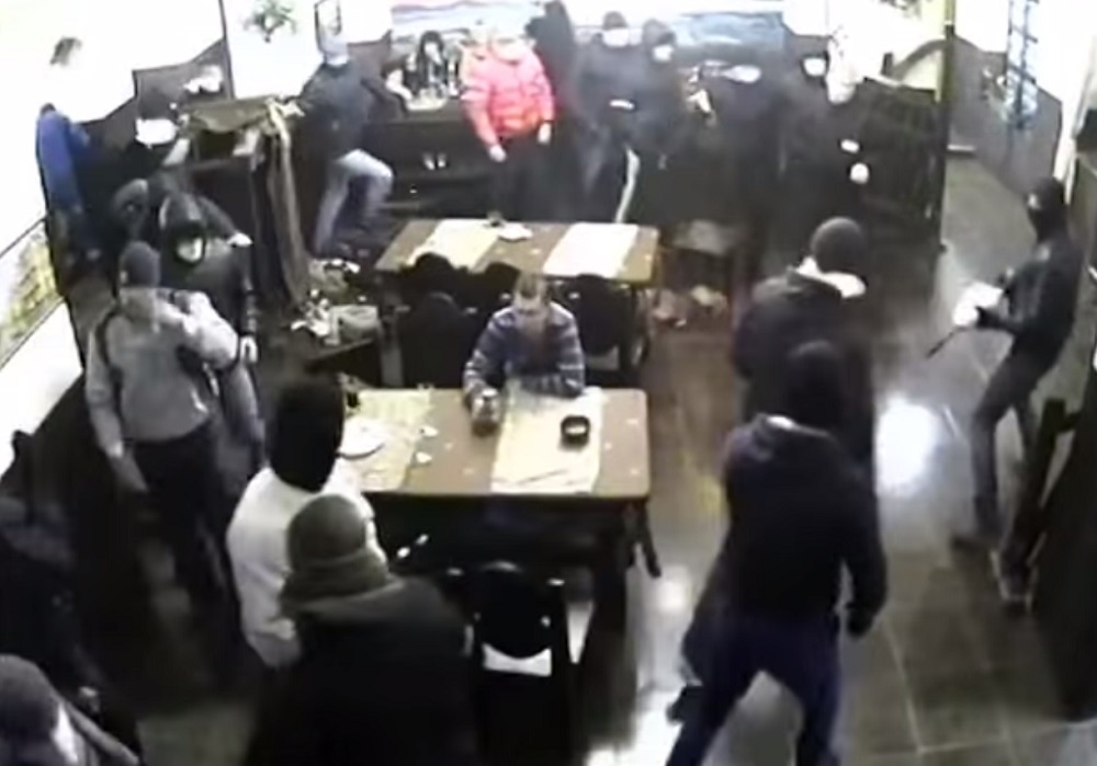 Nel video, ripreso dalle telecamere di sicurezza, si vede l’uomo sedere ad un tavolo con un amico. Poi ad un certo punto un numeroso gruppo di uomini mascherati e armati fa irruzione nel locale scatenando il panico e aggredendo i clienti: tutti quelli che possano cercano di scappare.