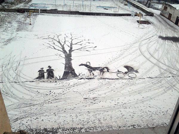 Nei nevosi giorni invernali, il cinquantunenne Seymon Bukharin usa la neve nel piazzale della scuola come tela per disegnare le sue opere, usando solo la pala come pennello.