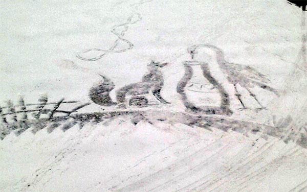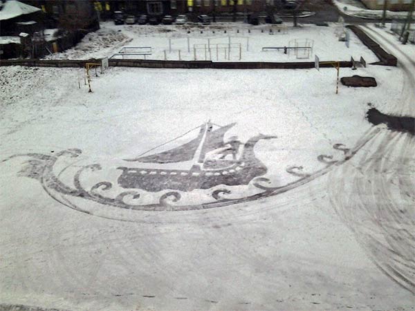 L’uomo ha anche fatto alcune sculture di neve, ma a quanto pare non ha abbastanza tempo per dedicarsi ad esse, e quindi deve “accontentarsi” di disegnare sulla neve.