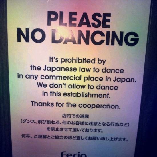 Sembra che la polizia giapponese abbia deciso di applicare la vecchia legge per cercare di combattere spaccio di droga e prostituzione senza dover avere mandati di perquisizione specifici, ma dati i contenuti della legge non può che arrestare i gestori dei locali da ballo. Finora, il risultato è stato che la parola “ballo” è praticamente sparita dalle locandine e dagli inviti dei locali, sostituita invece da cartelli di divieto e da buttafuori che impediscono agli avventori di ballare.