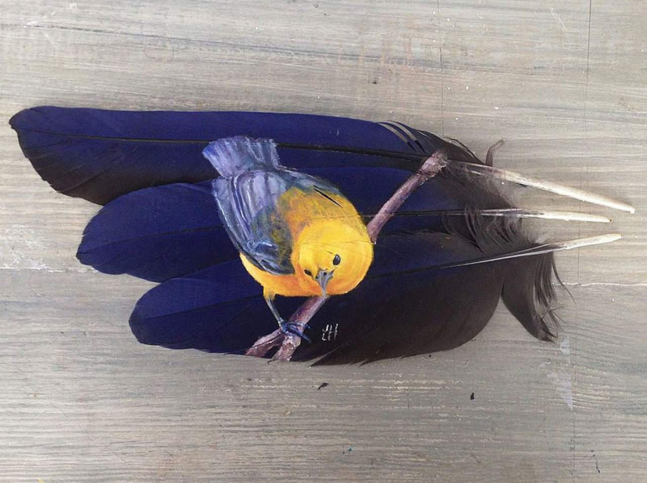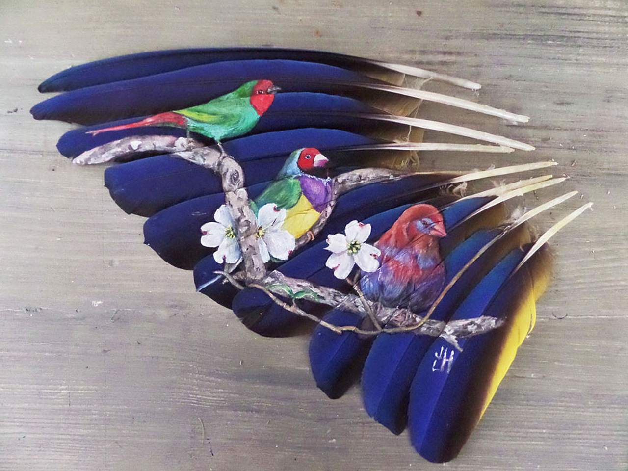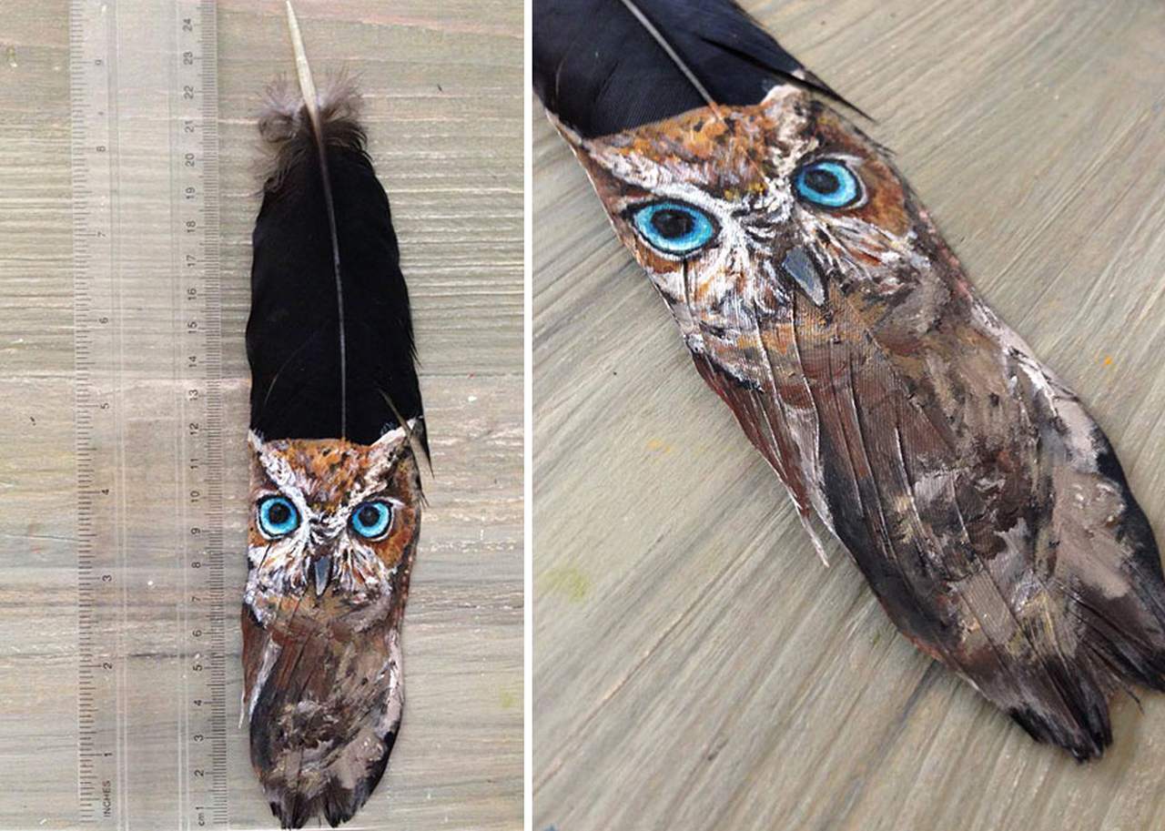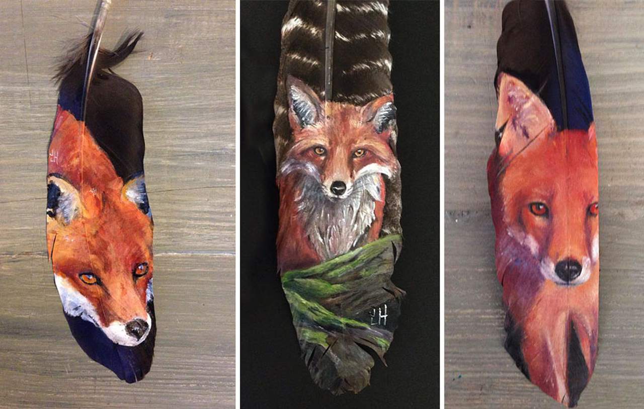 Jamie Homeister, un artista di New Albany nell’Indiana, è specializzato nel dipingere delicati disegni di animali e uccelli usando piume come tele, con uno stile che mescola la sua ascendenza Canadese con quella della tradizione dei nativi americani.