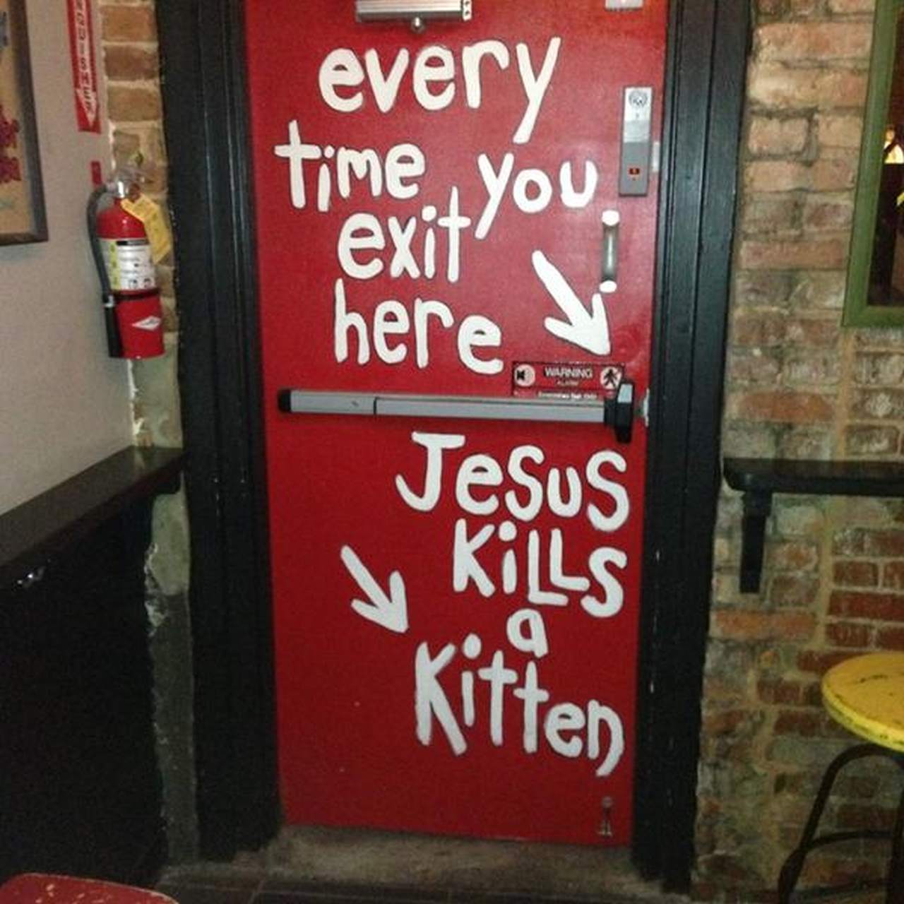 Il locale è famoso per le opere a tema religioso che lo arredano, spesso però con un taglio ironico e talvolta quasi blasfemo. Come ad esempio la scritta sulla porta di sicurezza (da usare solo per emergenza, e non per entrare o uscire normalmente dal locale): “Ogni volta che apri questa porta, Gesù uccide un gattino”. O il confessionale trasformato in cabina per fotografie, e l’organo trasformato in macchina per karaoke.