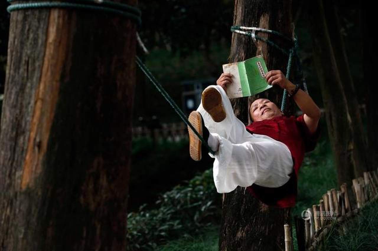 Qualcuno fatica a riposare comodamente su una semplice amaca: non è il caso del cinquantunenne Liang Yanguo, che riesce a dormire su una singola corda.