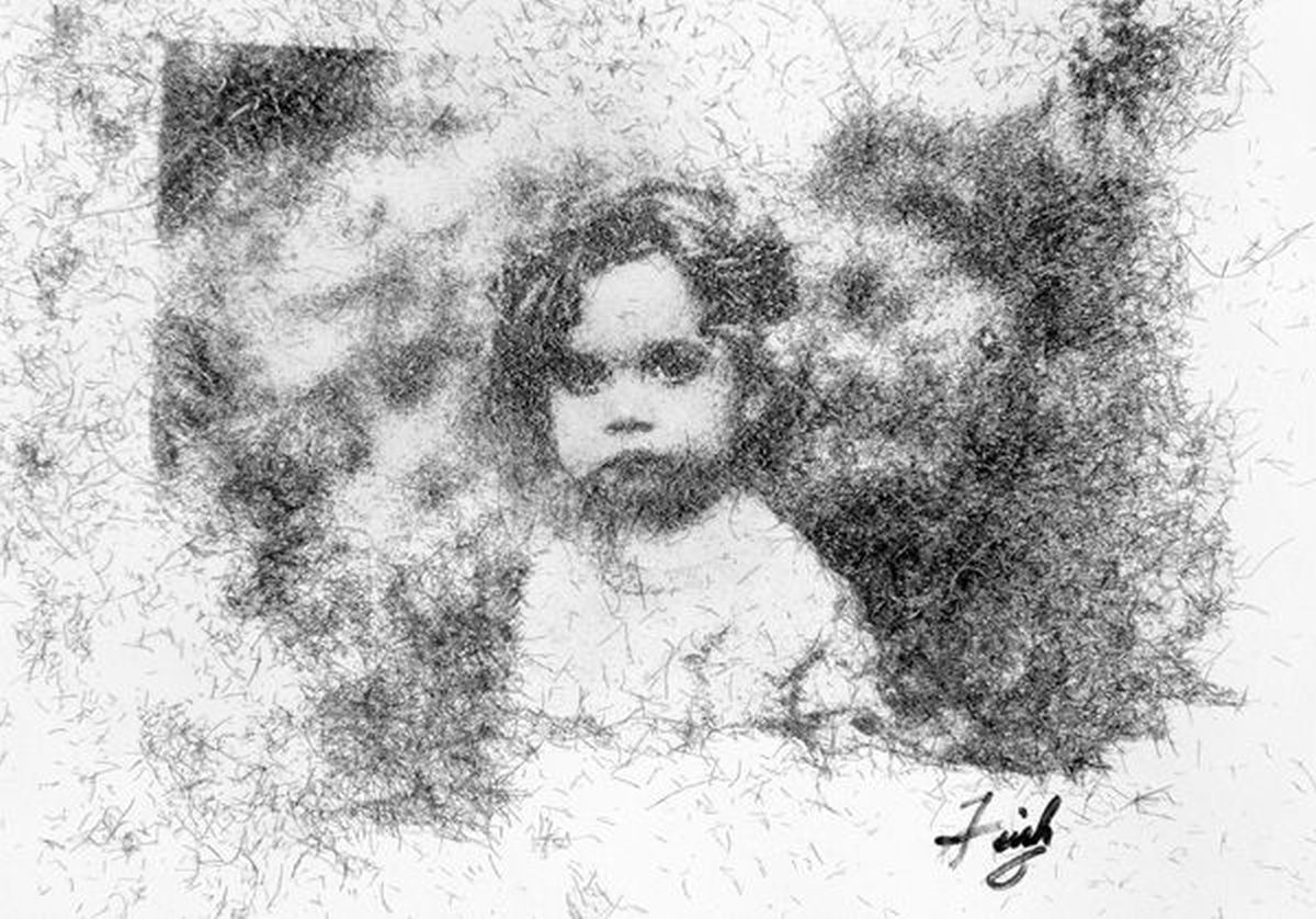 Tra i lavori più notevoi ci sono “My Eye”, un ritratto realizzato completamente usando i propri capelli, “Flowers”, realizzato intermente usando il polline come colore, “Chicken”, realizzato con gusci di uova, e anche “Ben”, realizzato con le ceneri dell’uomo ritratto.