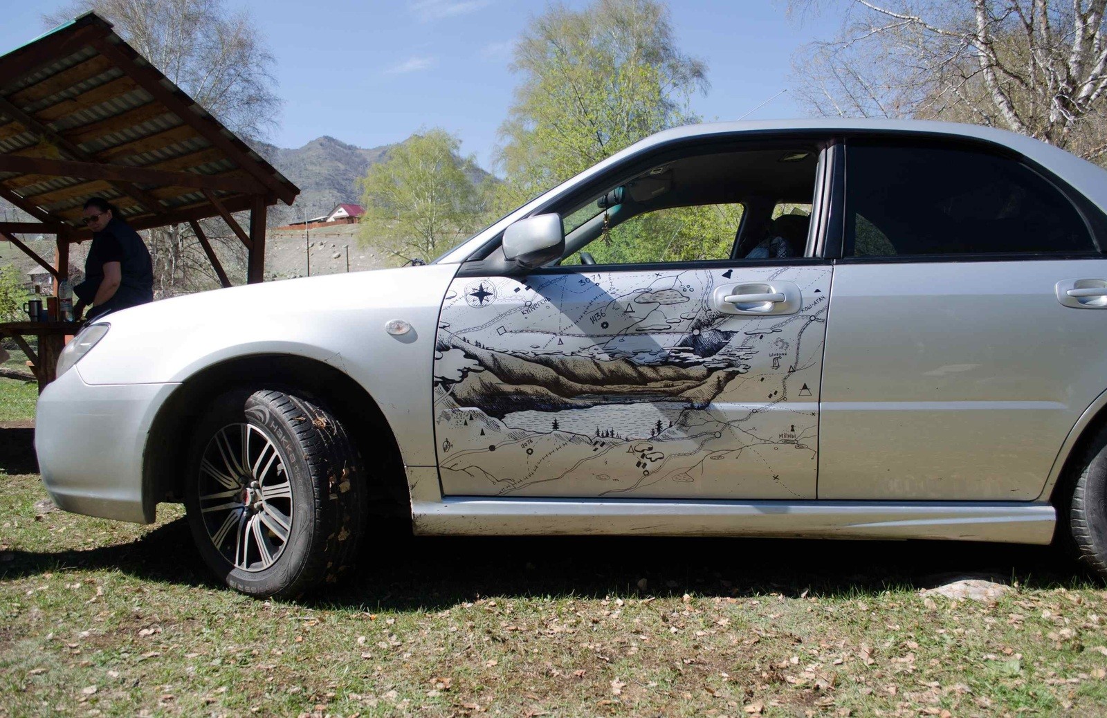 Avuta la notizia, l’uomo è rimasto un po’ deluso, decisamente scontento di dover andare in giro con la macchina ammaccata per così tanto tempo. Per scaricare la tensione ha deciso di fare un giro in macchina, e il panorama lo ha ispirato: ha deciso di trasformare la portiera in una mappa artistica dei vicini monti Altaj, dove l’ammaccatura e oi graffi sarebbe stata parte integrante dell’immagine.