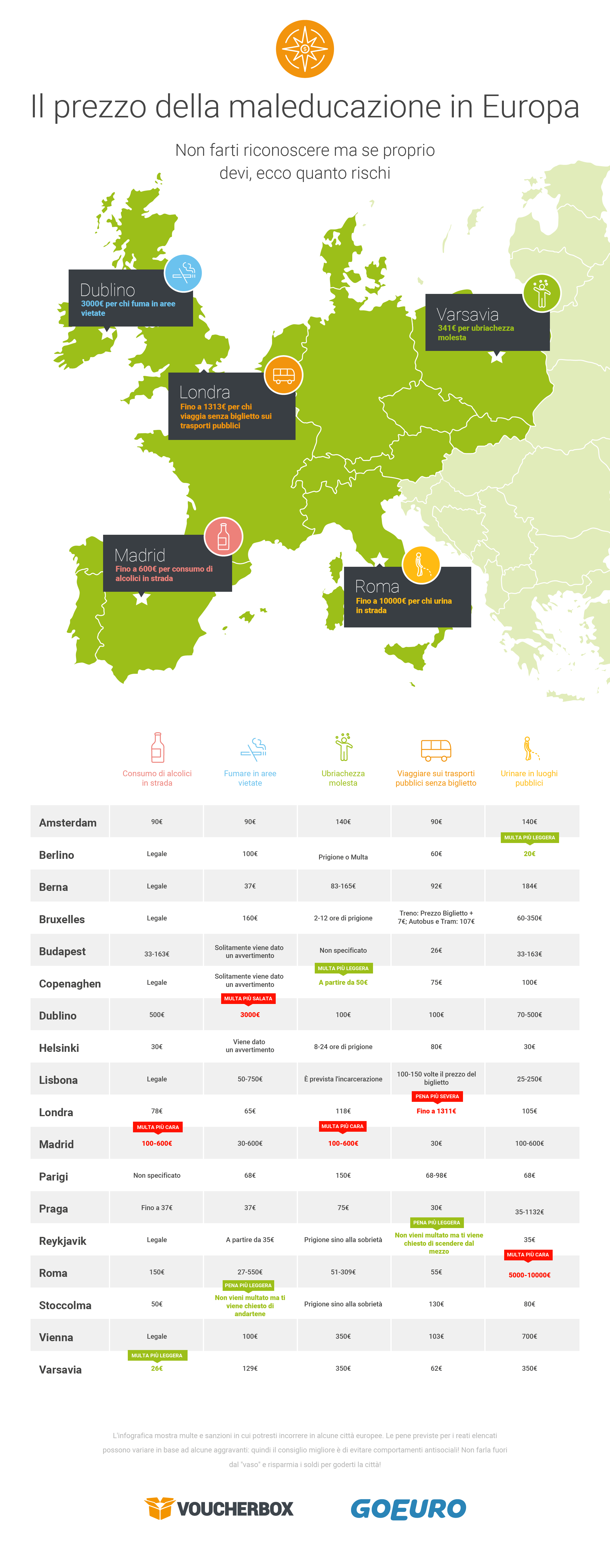 L’esempio più lampante è forse il divieto di fumo in vigore a Dublino: fumare in aree vietate può comportare una multa di 3.000 euro. All’esatto opposto c’è invece Stoccolma, dove invece se venite trovati a fumare in aree dove non è consentito, vi viene semplicemente chiesto di spegnere la sigaretta.