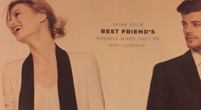 Nel 2015, la catena Bloomingdale ha lanciato una campagna il cui slogan era “Your Best Friend’s Eggnog When They’re Not Looking” (“Correggi lo zabaione della tua migliore amica mentre non guarda”). A peggiorare le cose, il fatto che raffigurasse una modella che rideva ed un uomo che la guardava serio alle spalle. Molti hanno criticato il fatto che fa passare il messaggio che cercare di approfittare di una donna ubriacandola o drogandola è una cosa accettabile, dato che sembra proprio questo l’oggetto della campagna. Inevitabilmente, la catena ha dovuto ritirare la pubblicità e scusarsi.