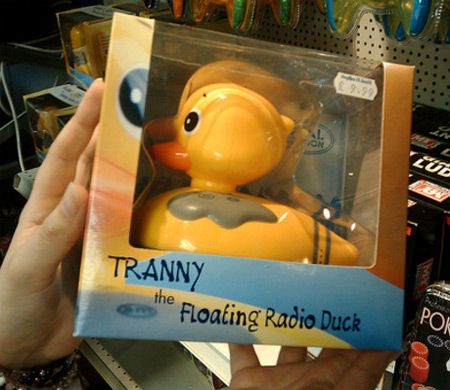 Primo: “Tranny” in inglese significa “trans”, e dato che il prezzo è in sterline chi sta vendendo il prodotto lo sa bene. Forse non è il nome più adatto ad una paperella. Secondo: dato che è un prodotto (anche) da bambini forse non è il caso di dare un nome che se inserito su Google dà esclusivamente risultati vietati ai minori.