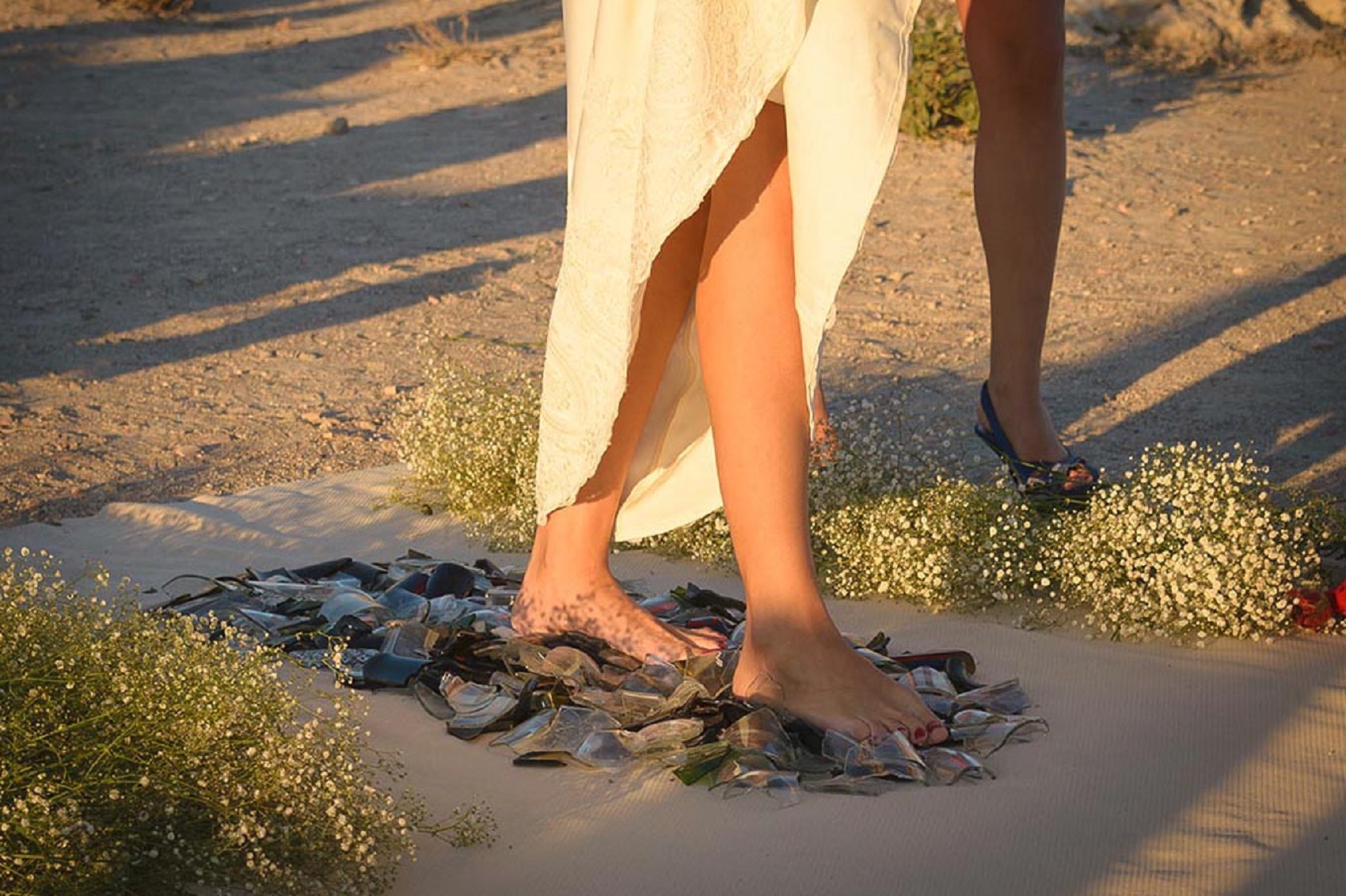 Gli sposi che decidono di inserire la “camminata sui vetri” nel loro matrimonio devono prima fare alcune sessioni di allenamento, in modo che possano imparare come camminare a piedi nudi sui vetri senza farsi male, e abbiano il giusto atteggiamento durante la cerimonia.