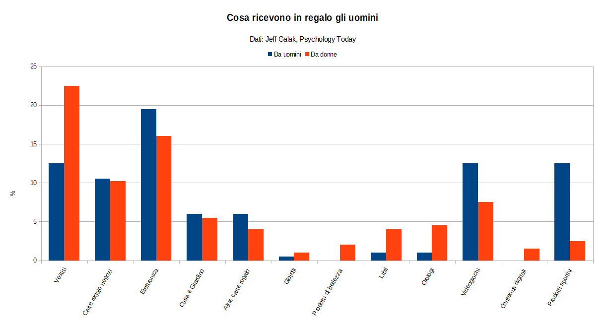 S i può notare dal grafico che, come abbiamo anticipato, ci sono differenze sostanziali nel tipo di regali che gli uomini ricevono da altri uomini oppure da donne, che possono essere di spunto per trovare idee regalo non banali. Ricordate però che il regalo deve essere pensato per la persona specifica, quindi gli studi generali devono essere presi in considerazione come tali.